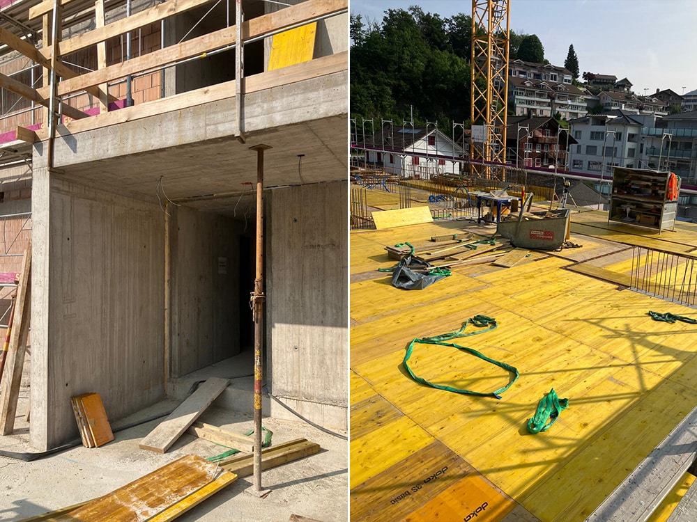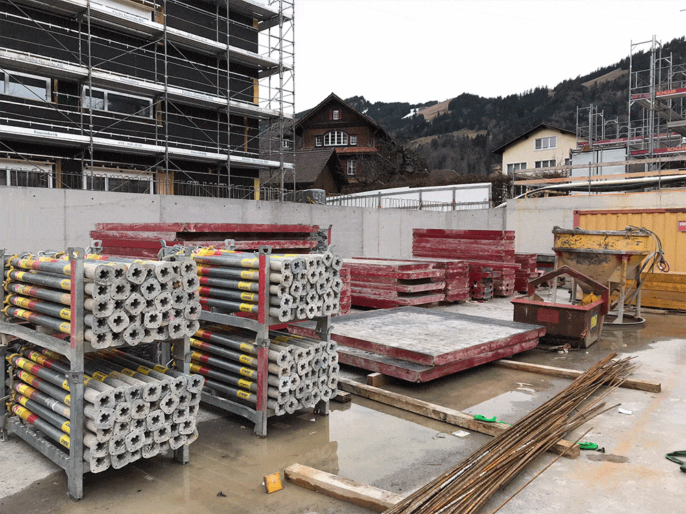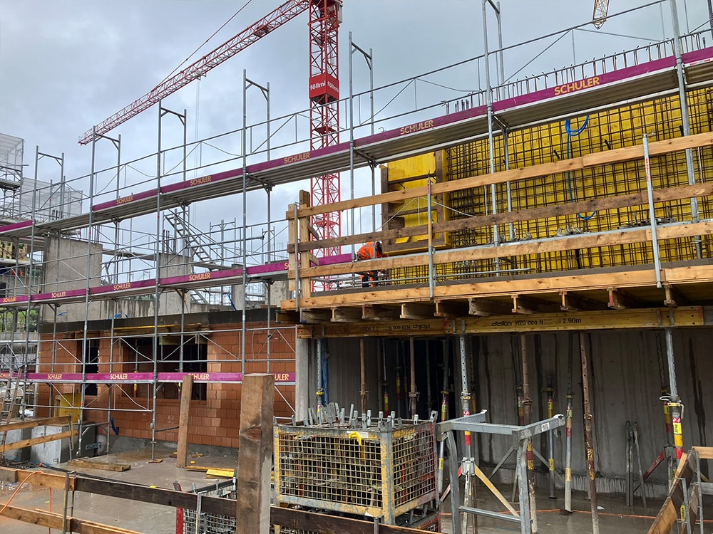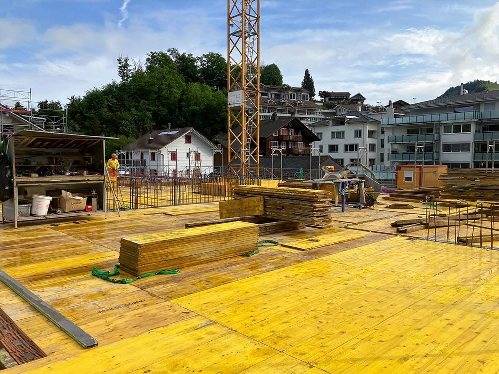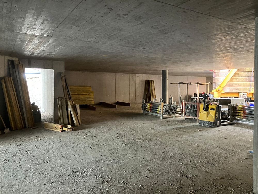 Die Tiefgaragendecke wird weiter geschalt und die erste Etappe ist bereit für die Armierung.