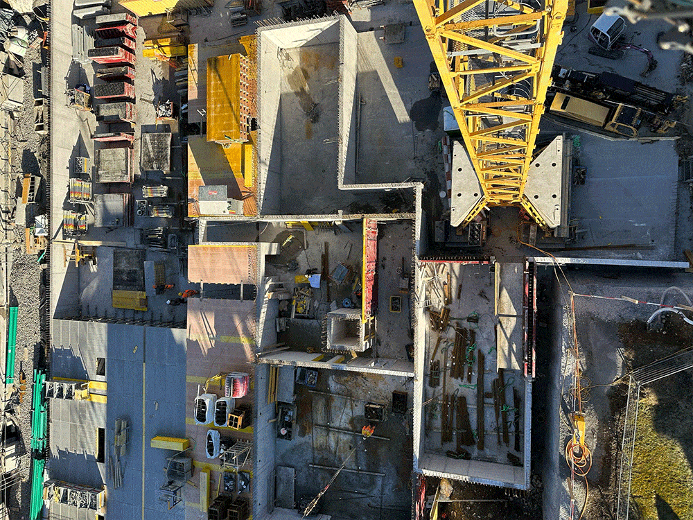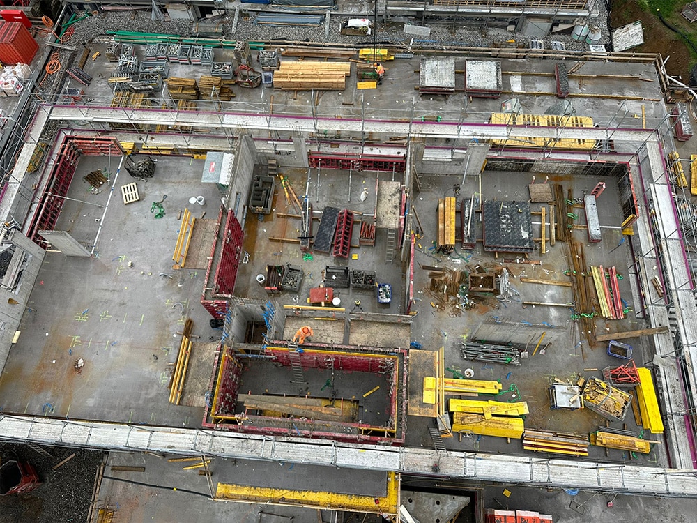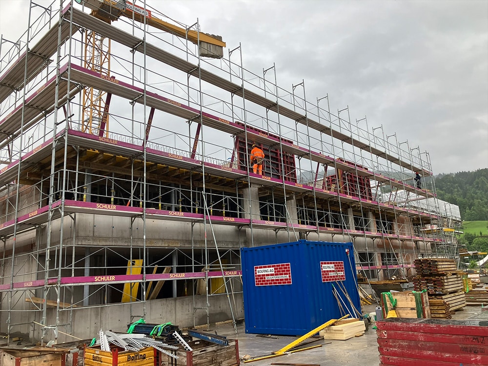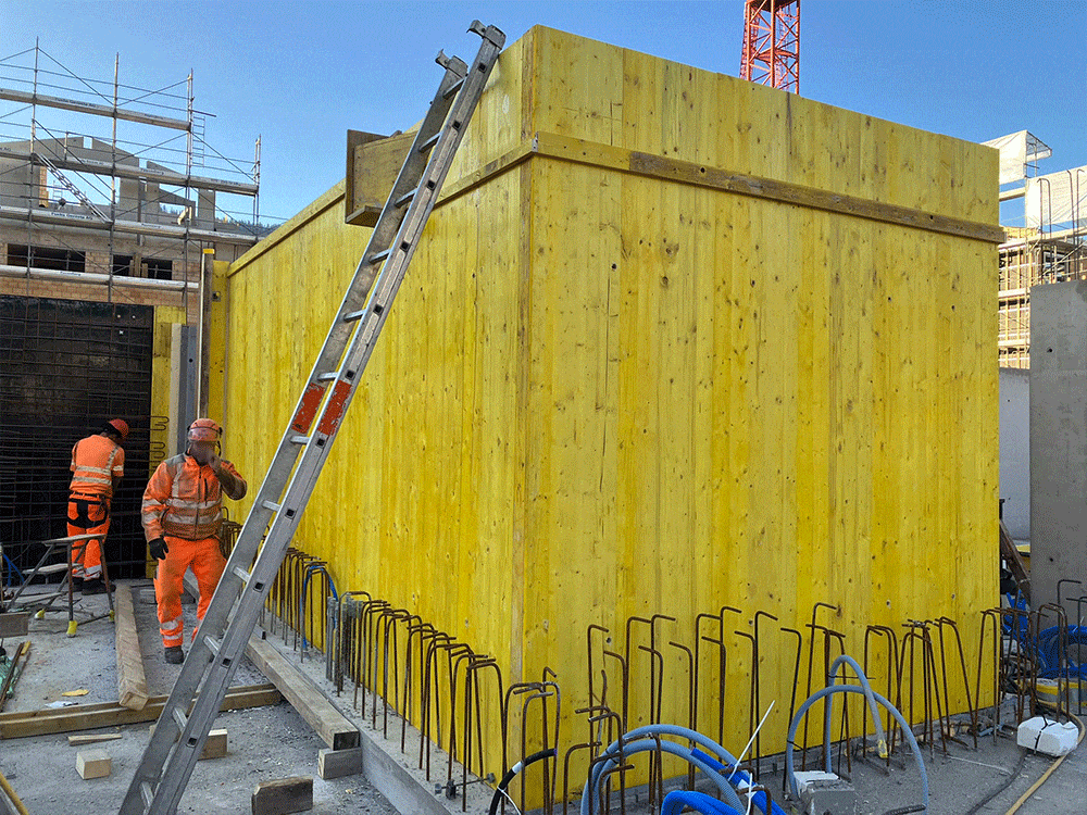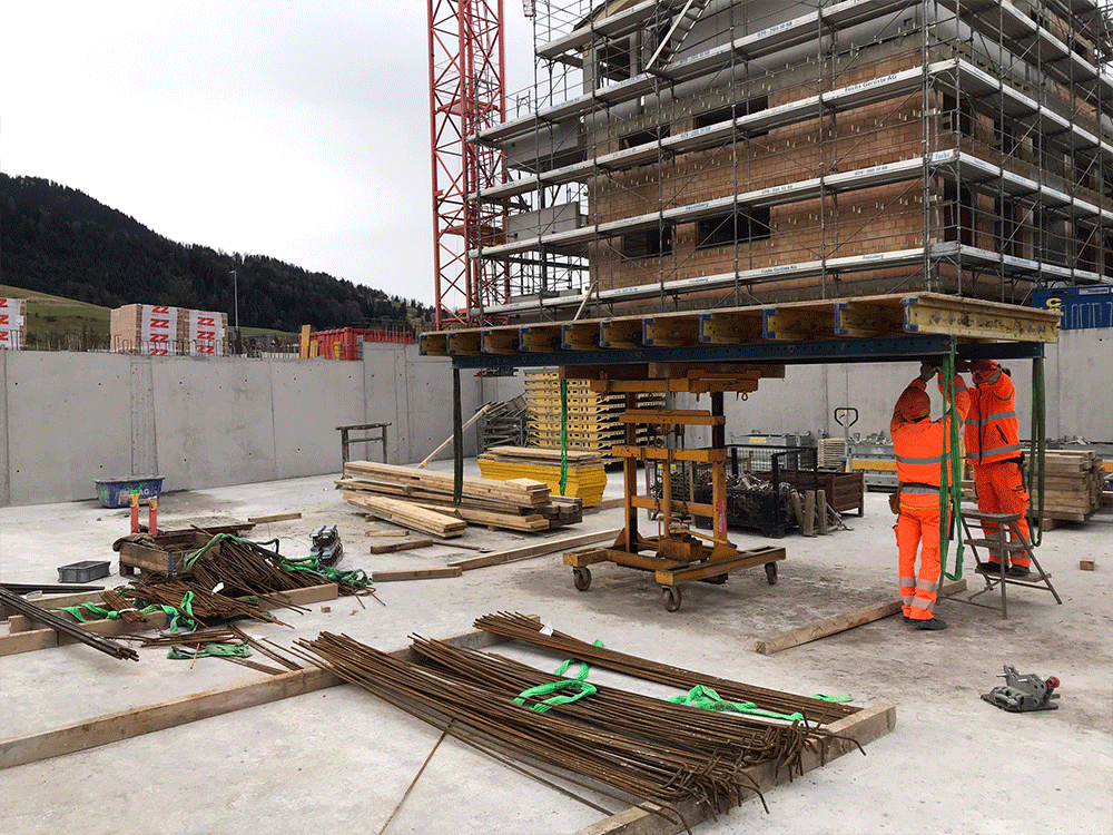 Die Tiefgaragendecke wird weiter geschalt und die erste Etappe ist bereit für die Armierung.