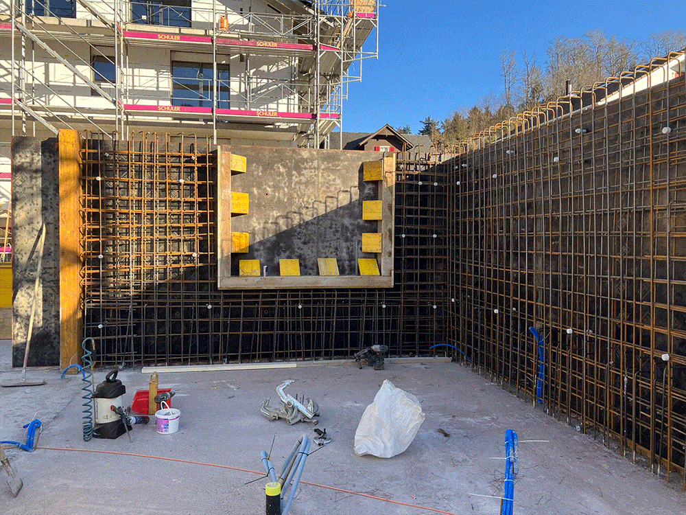 Die zweite Etappe der Tiefgaragendecke ist bereits betoniert und bis Ende Woche wird auch die 3. Etappe betoniert. Die Arbeitsfugen an den Kelleraussenwänden wurden abgedichtet und vorbereitet zur Hinterfüllung.