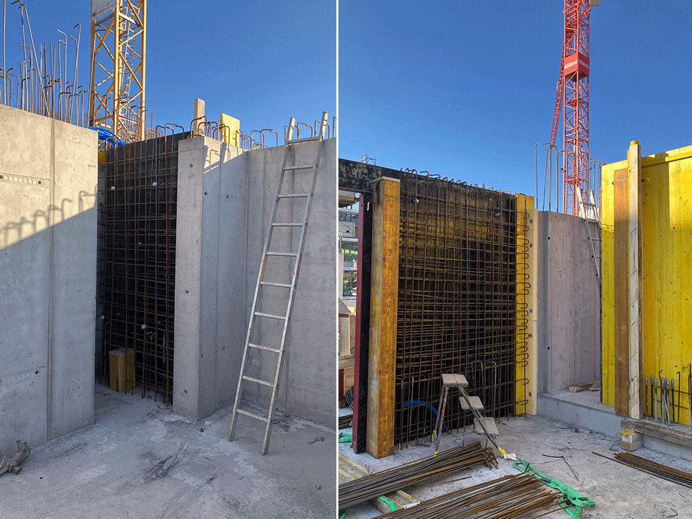 Die letzte Etappe der Tiefgaragendecke wird bewehrt und die ersten Wände des Erdgeschosses sind bereits betoniert. Die ersten Treppenelemente für das Treppenhaus sind ebenfalls eingetroffen.