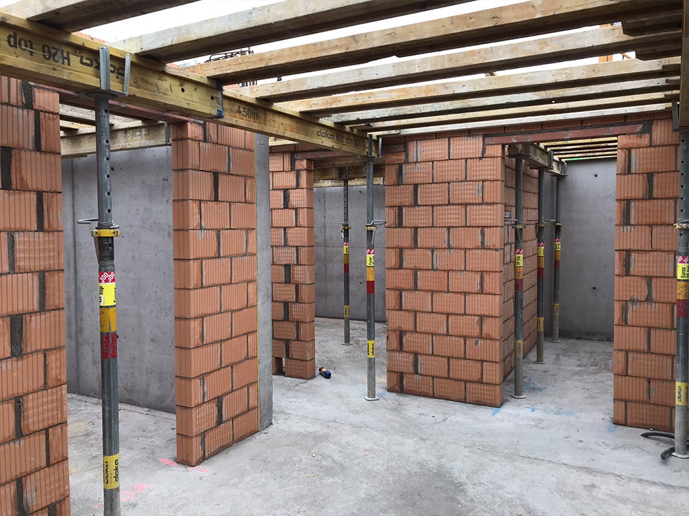 Im 2.OG werden die letzten Wände geschalt und betoniert. Parallel wurde mit dem Mauerwerk begonnen undbald schon kann mit der Deckenschalung gestartet werden.