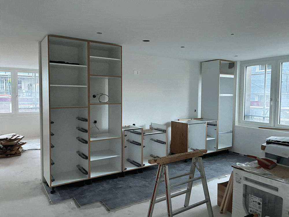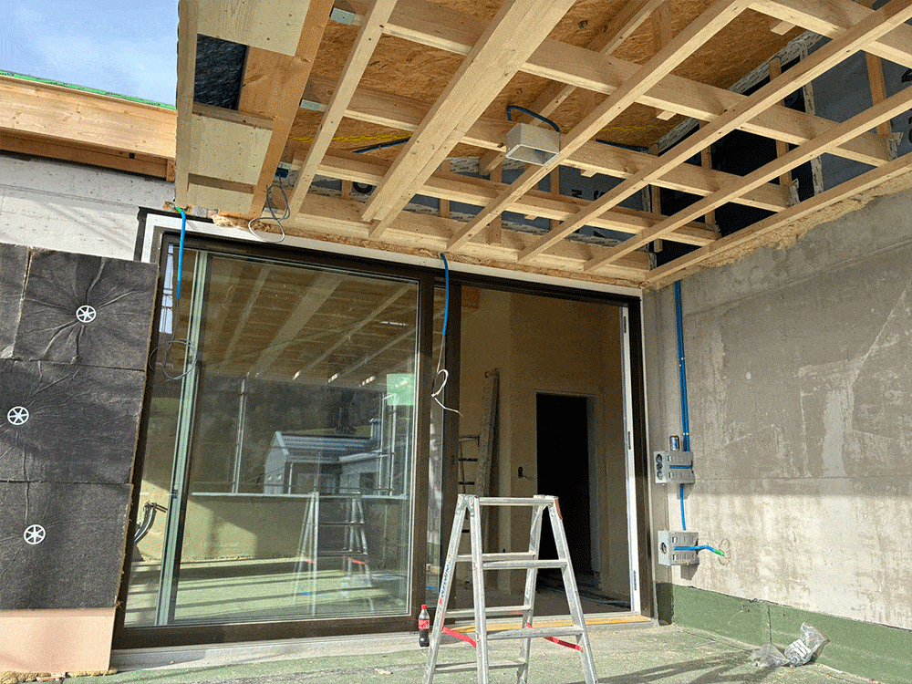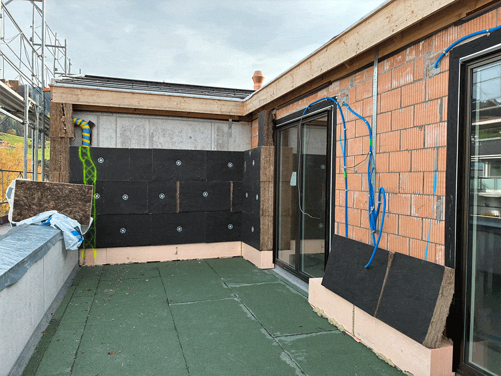 Aussen werden die Dachuntersichten bei den Terrassen erstellt und an der Fassade wird die Dämmung angebracht. Als nächstes nehmen wir den Unterlagsboden mit Wärmedämmung und Fussbodenheizung in Angriff.
