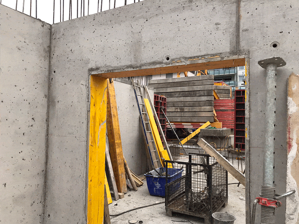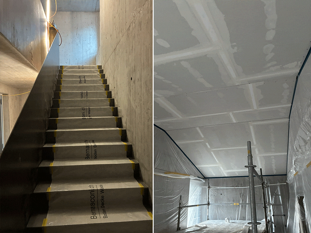 Sichtbetonwände und Schalung im Treppenhaus UG – EG.
