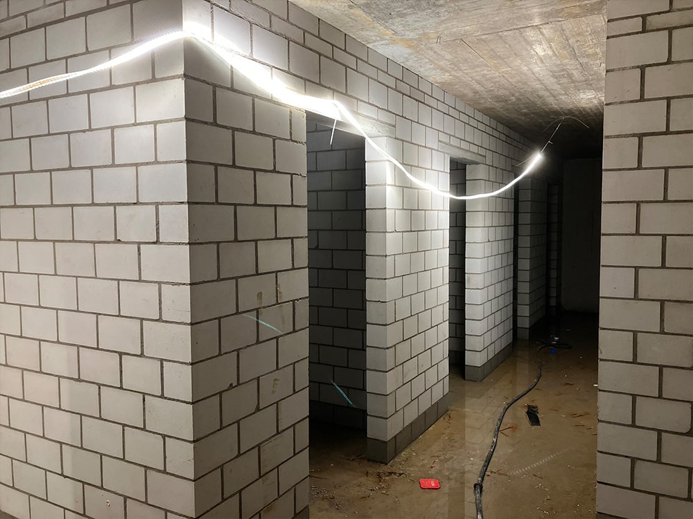 Heute wurden die Wände im 1.OG geschalt, armiert und betoniert. Auf den Betondeckel wurden bereits die Platzierung der Backsteinmauern angezeichnet. Diese werden in den nächsten Tagen ebenfalls erstellt.
