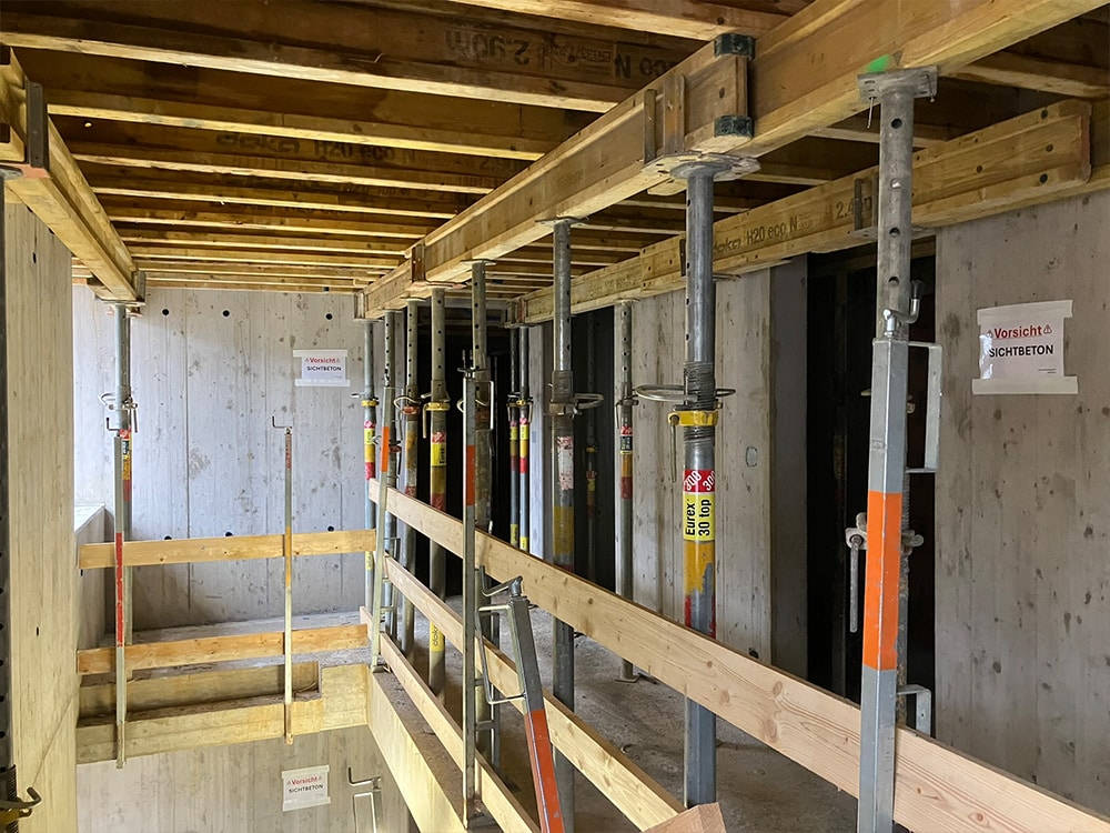 Wir sind an der Deckenschalung für die EG-Decke dran. Die Sicherheit wird bei uns und unserem Baumeister Bolfing AG gross geschrieben. Deshalb wird bei der Schalungsarbeit auch ein Auffangnetz darunter gespannt, um das Abstürzen der Arbeiter zu verhindern. Der Sichtbeton im Treppenhaus stellt die Bauherrschaft zufrieden.