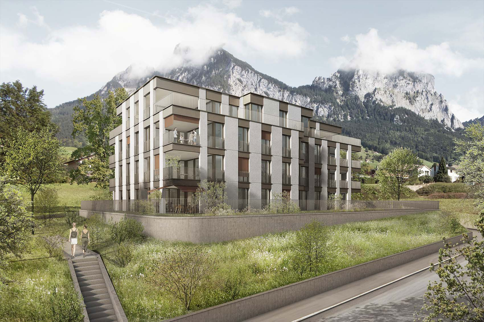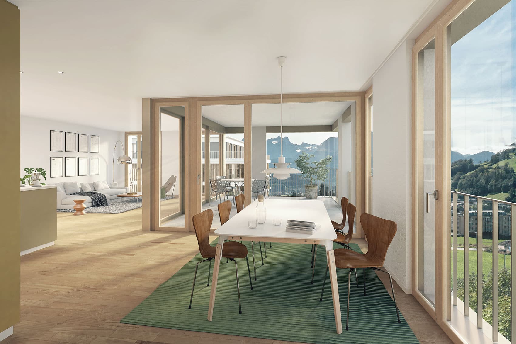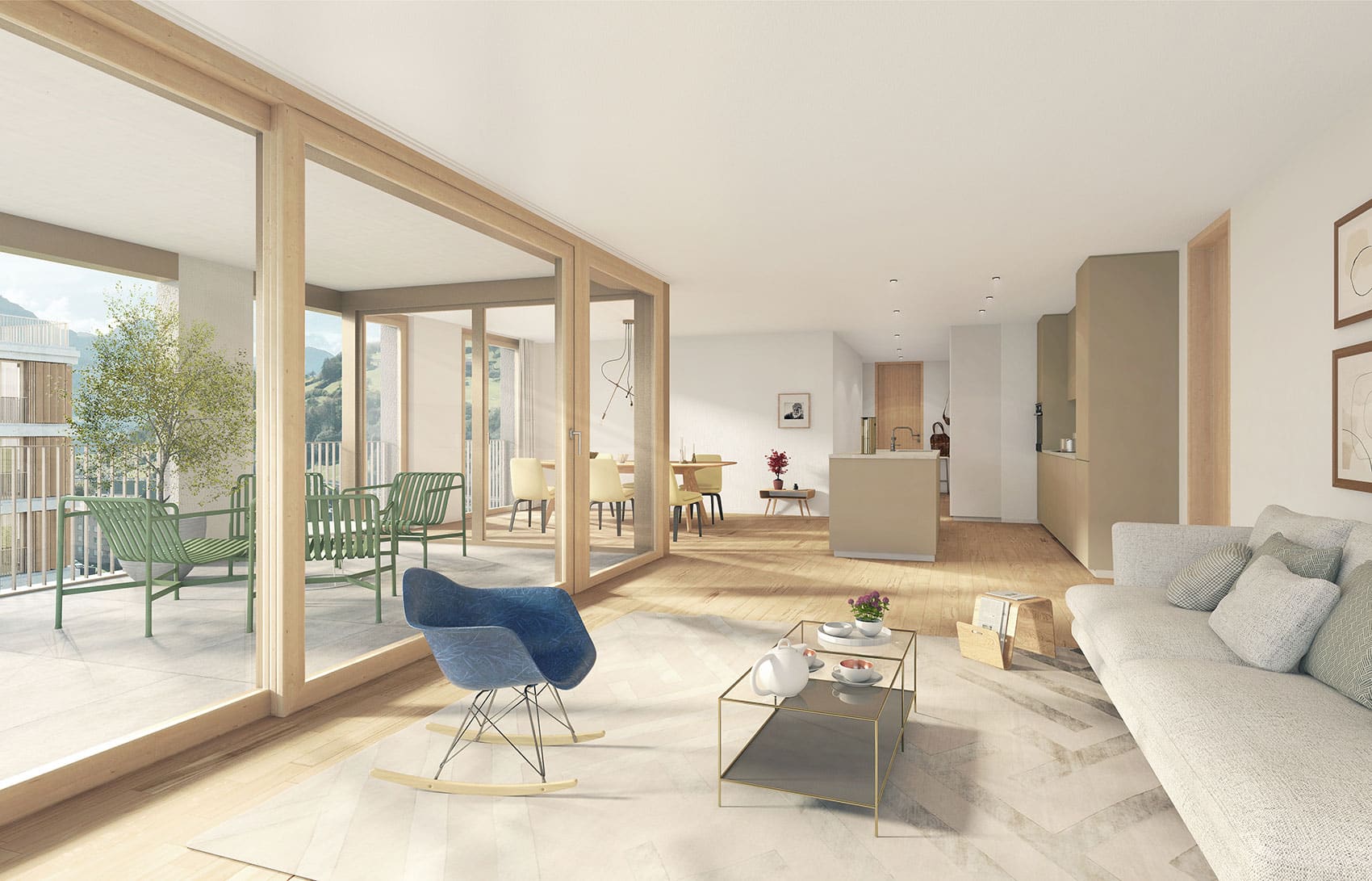 Sämtliche Wohnungen teilen sich die gleiche räumliche Idee – sie sind unterteilt in einen Nacht- und Tagbereich. Im zurückgezogenen Nachtbereich befinden sich die Zimmer und Nasszellen. Im Tagbereich befinden sich die Ess-, Koch- und Wohnzone sowie eine Loggia. Getrennt werden diese Innenräume und die Loggia lediglich durch eine Fensterfront. Dadurch nimmt man den gesamten Tagbereich als einen grossen Raum wahr.