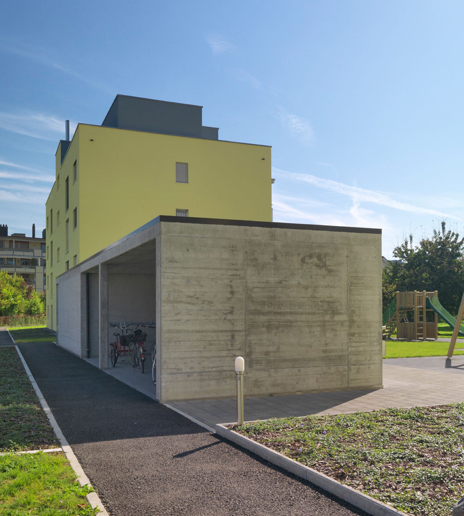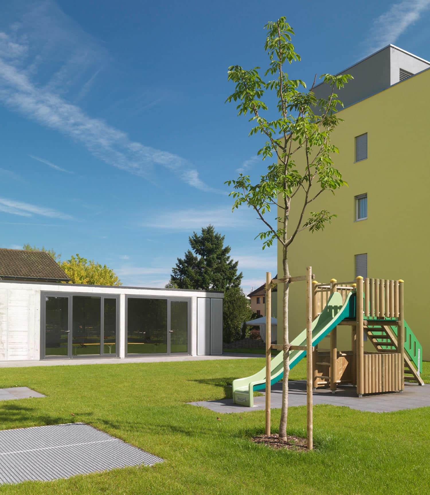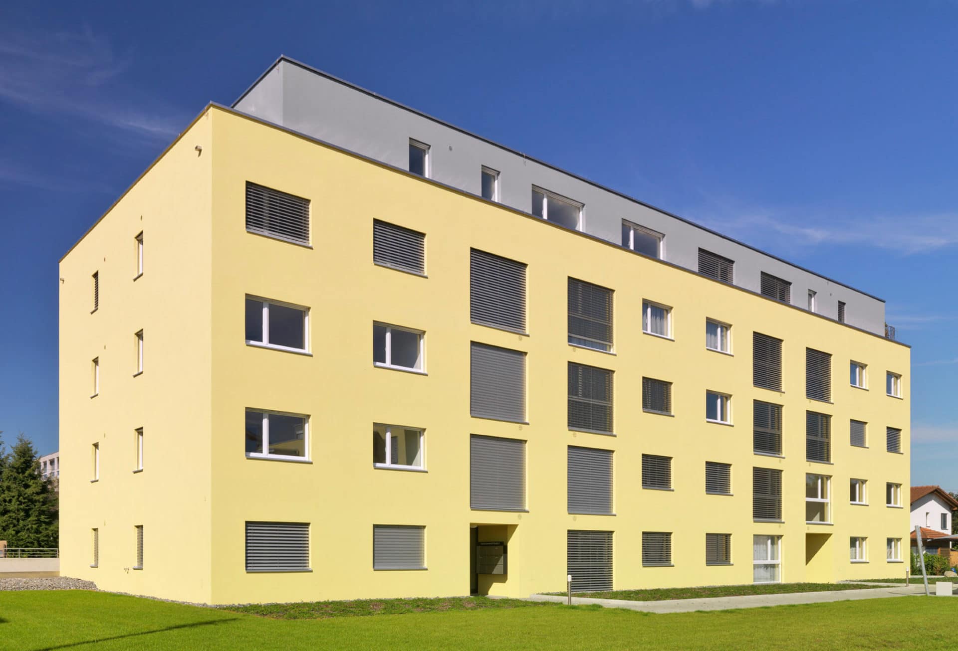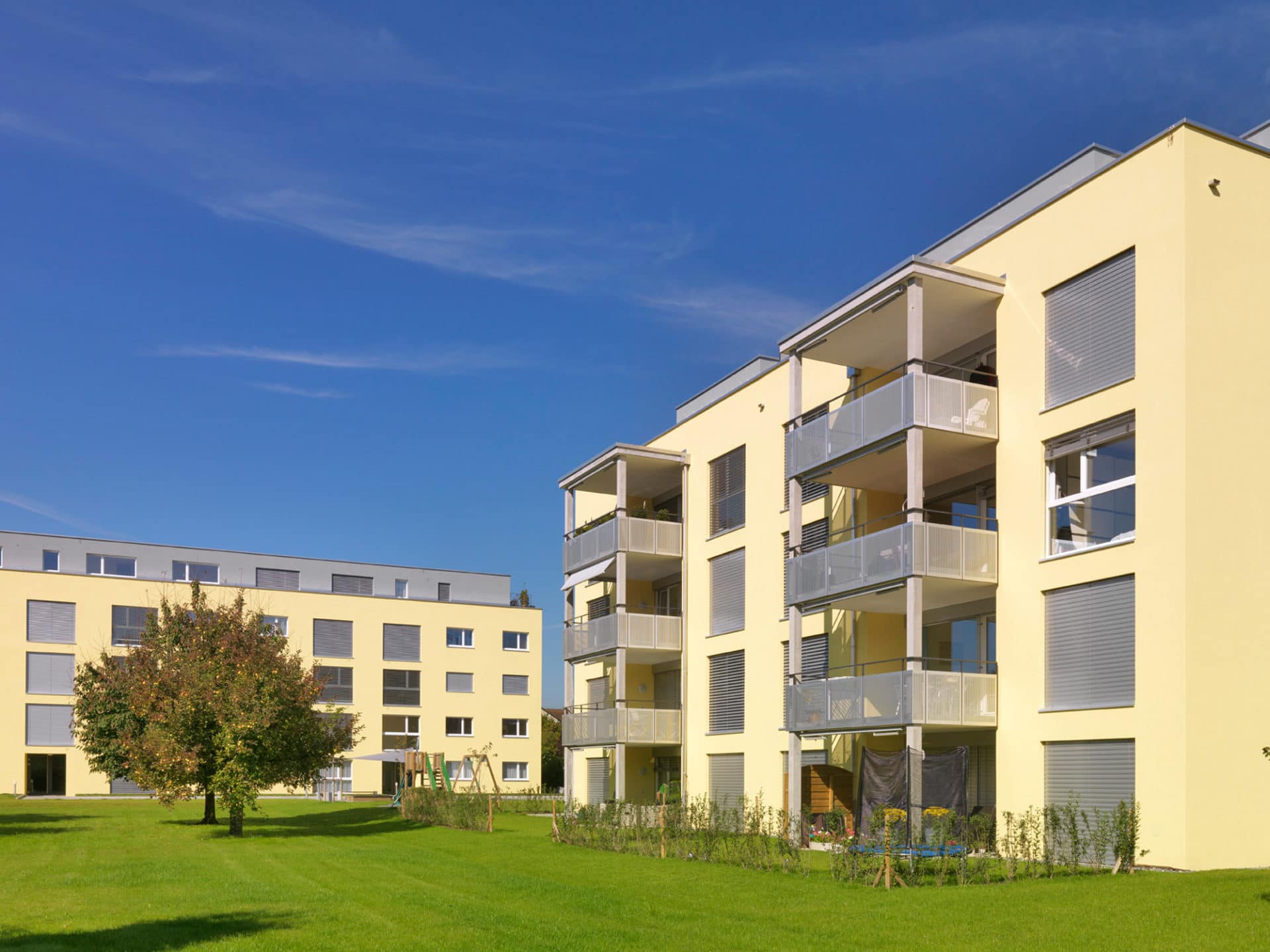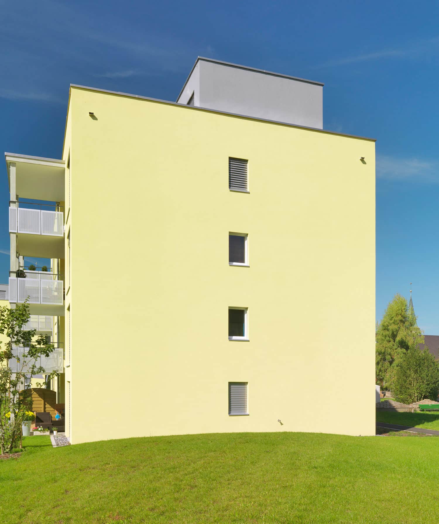 Mit der Überbauung wurde eine zentrumsnahe und doch ruhige Parzelle erschlossen. Es entstanden zwei autonome Baukörper mit zeitgemässen Mietwohnungen und attraktiven Grundrissen. Die vier Attikawohnungen verfügen über grosszügige Terrassen mit idealer Besonnung und fantastischer Weitsicht. Die verkehrstechnische Erschliessung erfolgt von der Hinteren Bahnhofstrasse aus direkt in die Einstellhalle. Das ganze Areal ist somit verkehrsfrei und verspricht eine hohe Wohnqualität. Die Grünfläche mit angrenzenden Obstbäumen verleiht der Überbauung einen ländlichen Charakter.