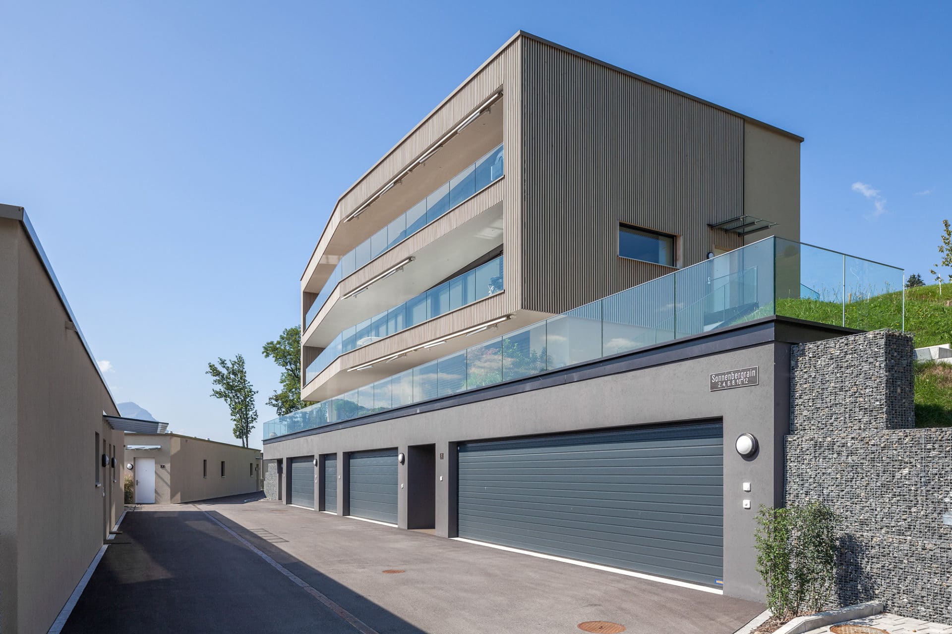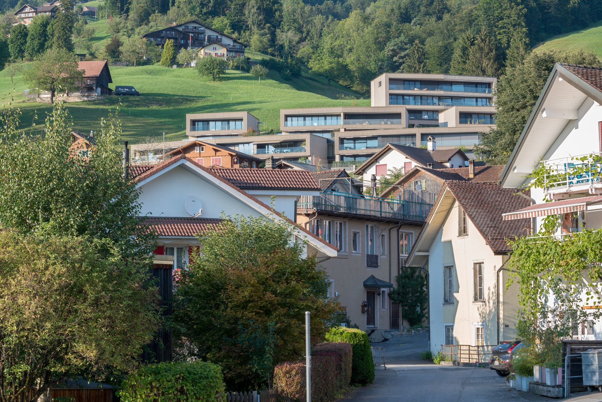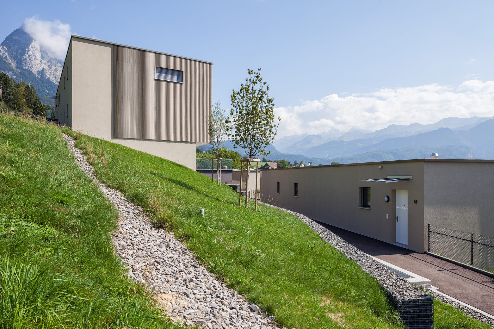 Die Fassadenbegrünung soll in den nächsten Jahren für eine zusätzliche Verwebung mit der Landschaft sorgen. Die Eingangsseite bekommt mit der dunklen Blend-Glasfassade einen edlen und spannenden Touch. In ihr spiegeln sich die imposanten Urner Alpengipfel und es entsteht ein abwechslungsreicher Dialog mit der Umwelt.