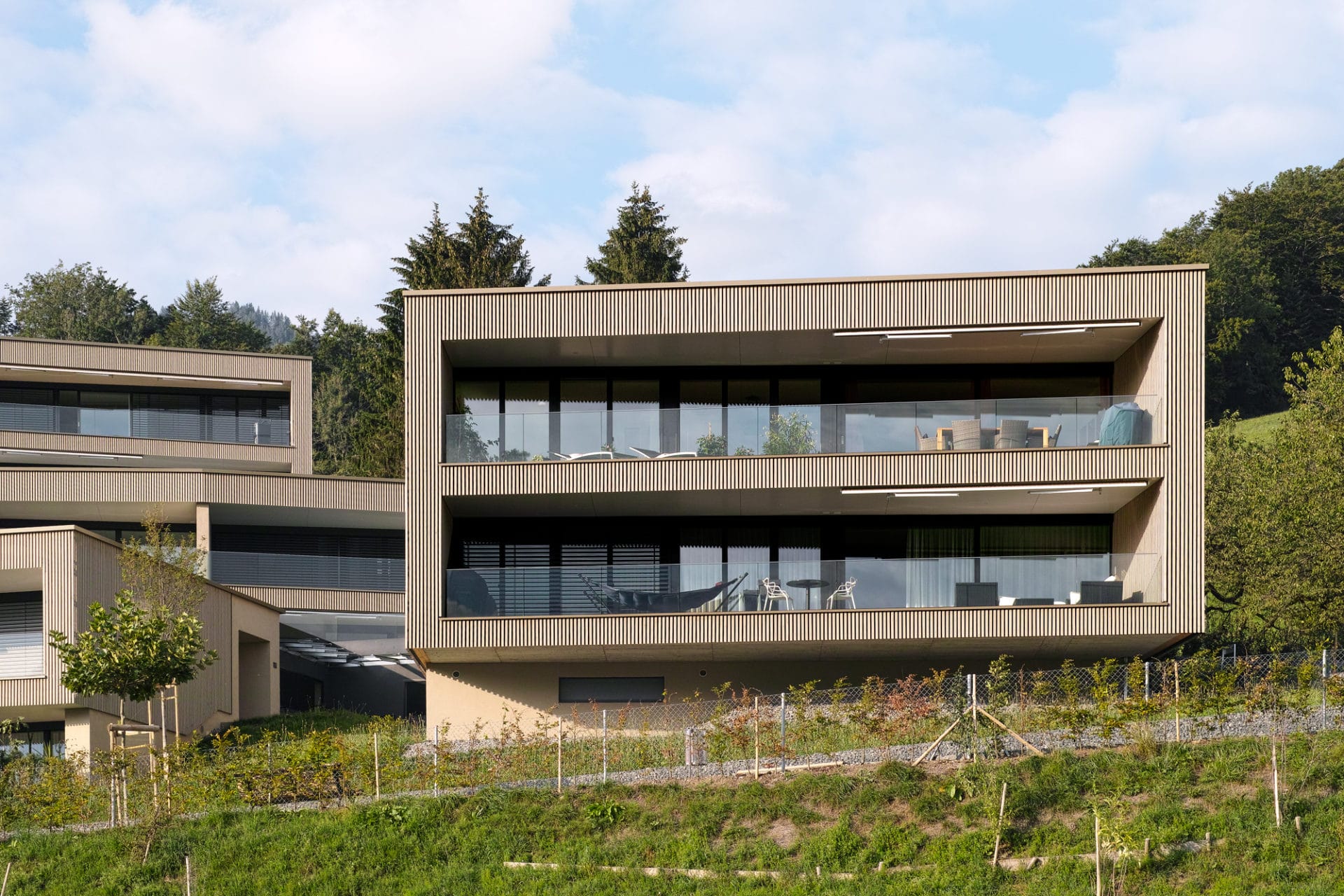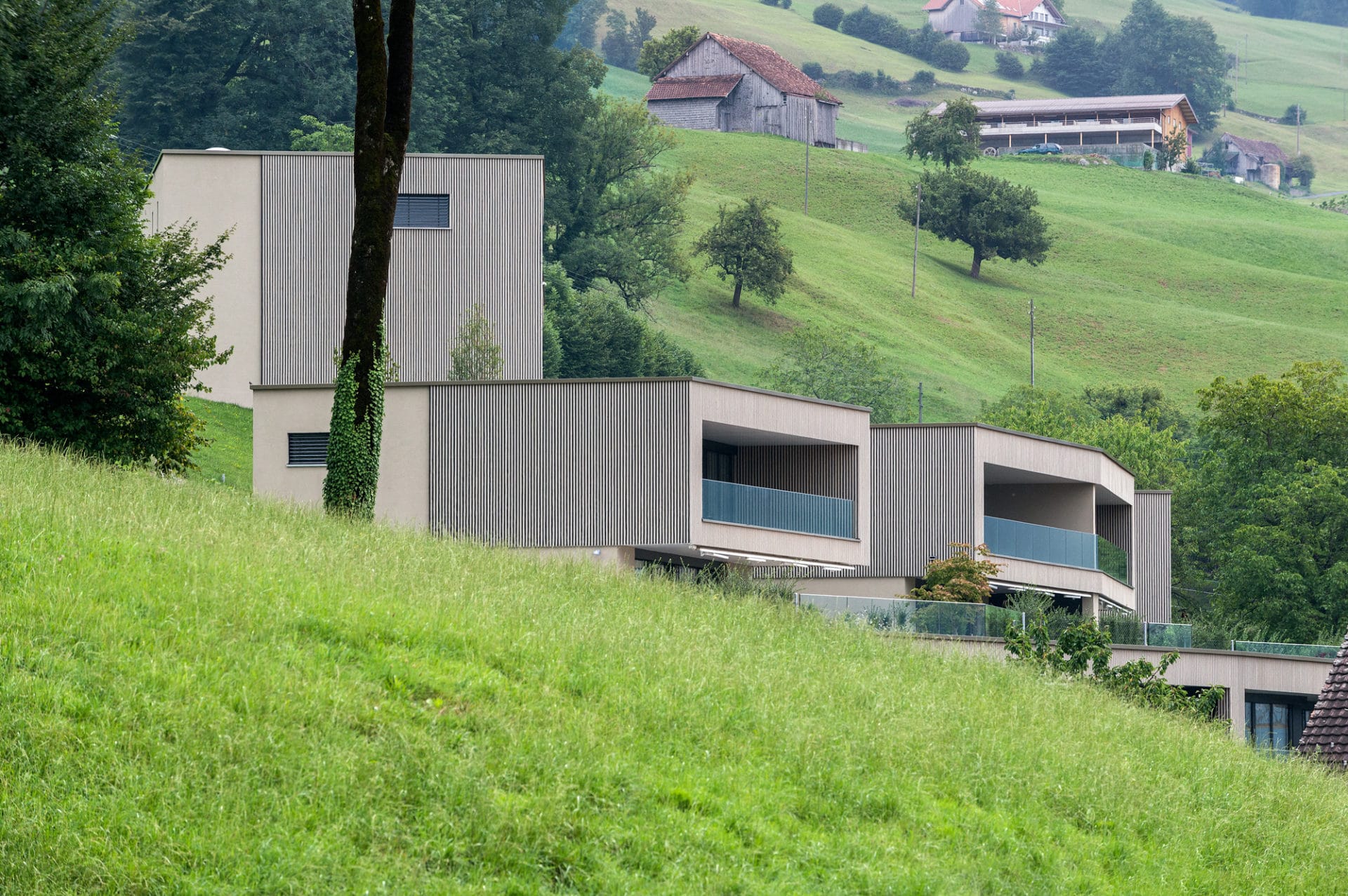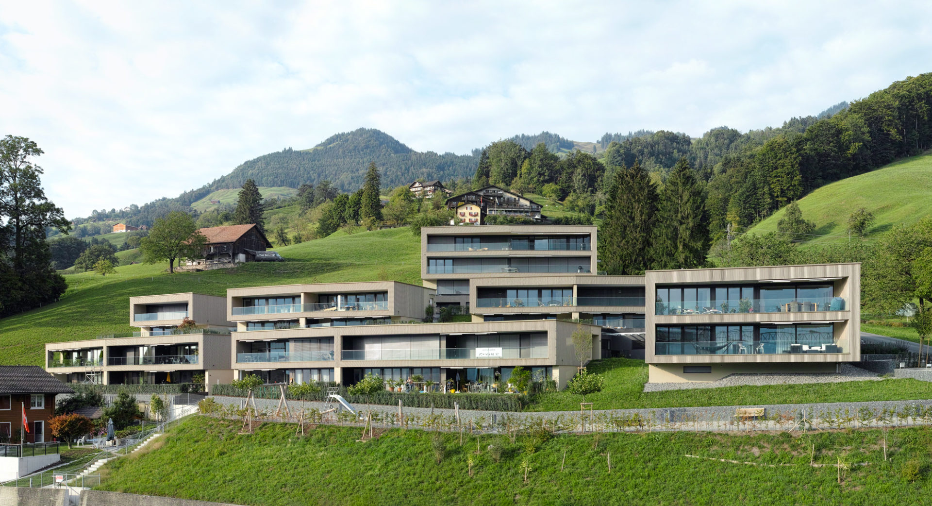 Die Fassadenbegrünung soll in den nächsten Jahren für eine zusätzliche Verwebung mit der Landschaft sorgen. Die Eingangsseite bekommt mit der dunklen Blend-Glasfassade einen edlen und spannenden Touch. In ihr spiegeln sich die imposanten Urner Alpengipfel und es entsteht ein abwechslungsreicher Dialog mit der Umwelt.