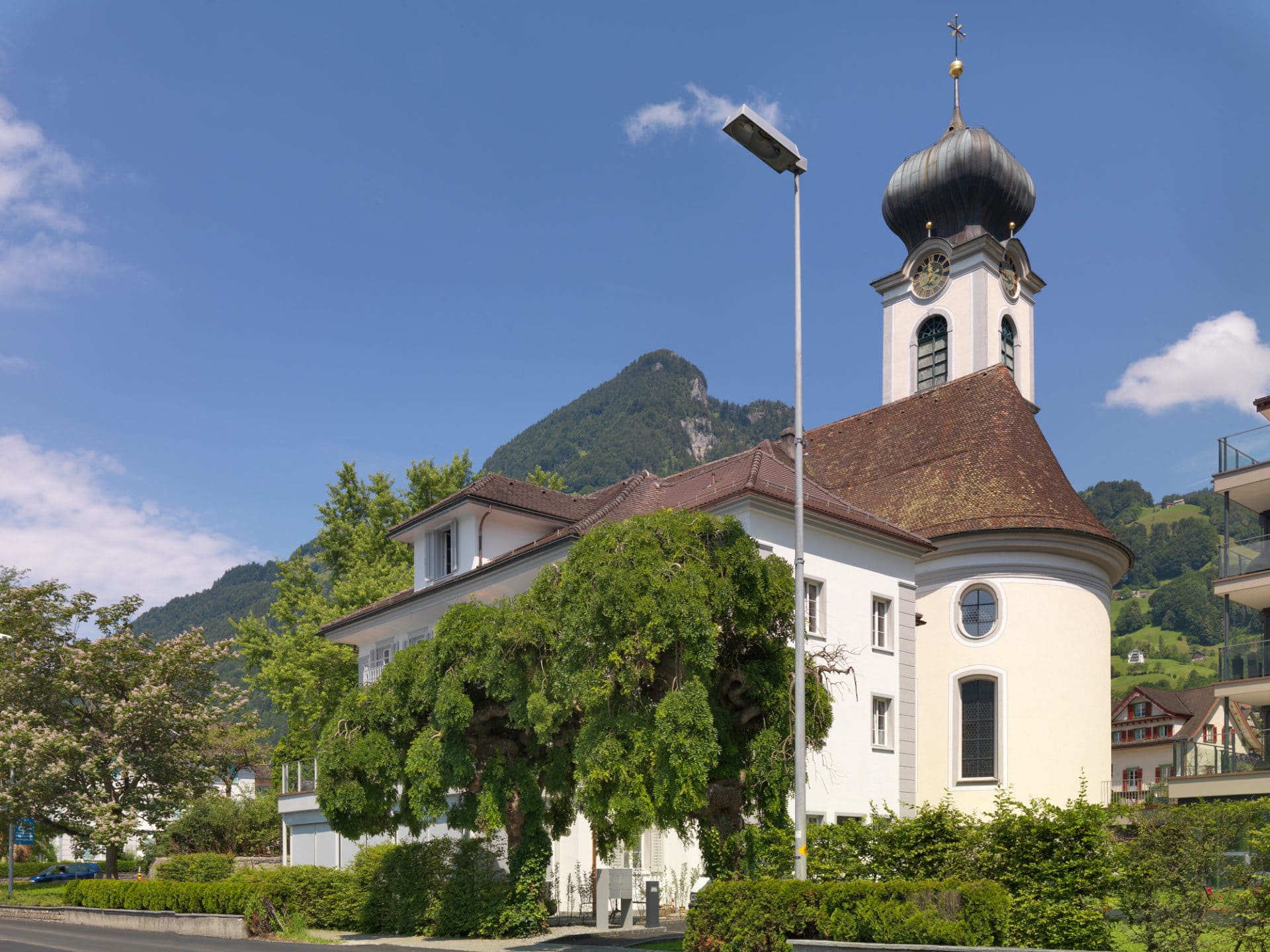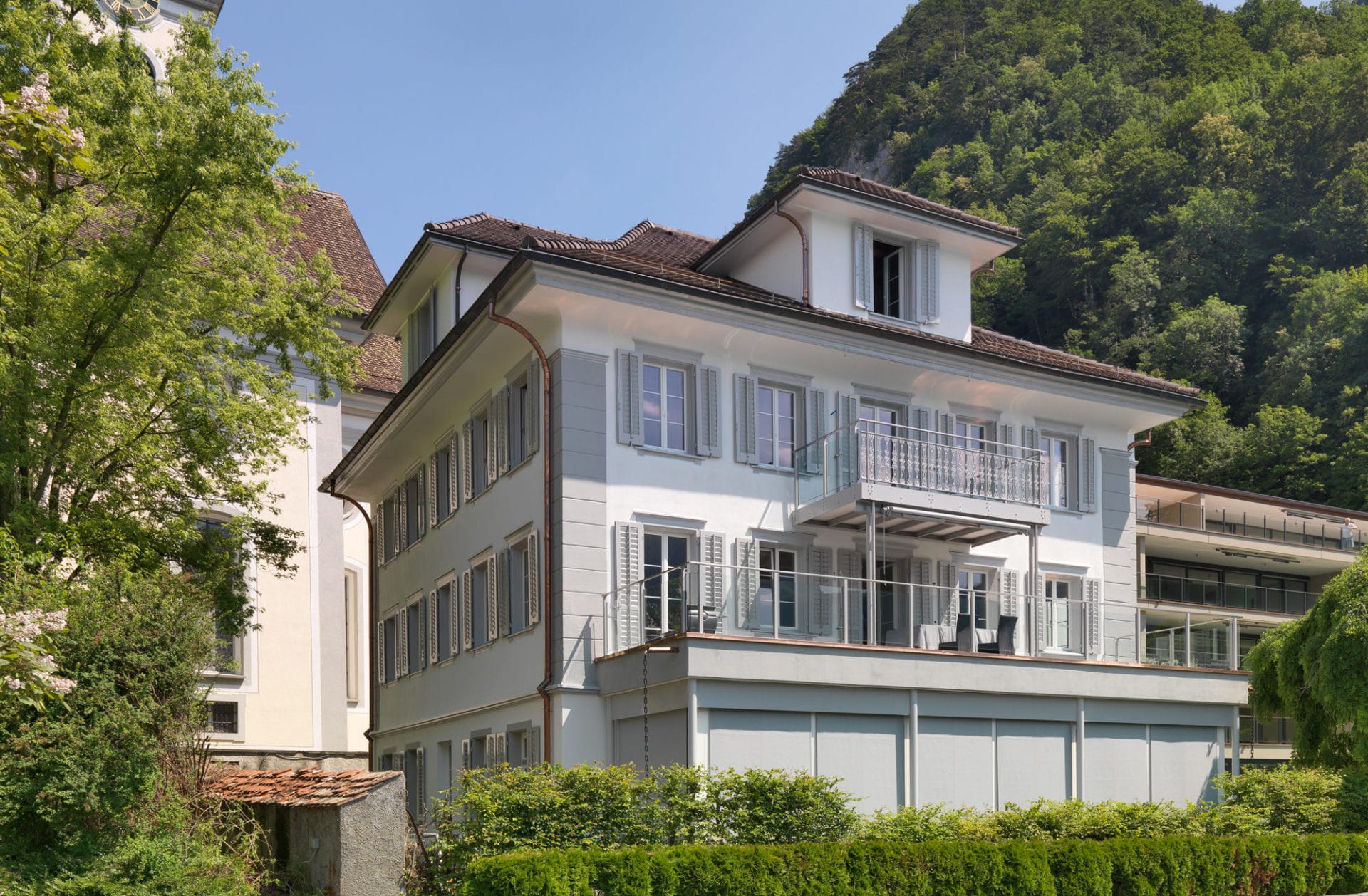 Die von ihrem ursprünglichen Standort verschobene, modernisierte und renovierte Villa Maria wird nach Westen vom zur Kirche zugehörenden Park, im Süden vom See, im Norden von der Kirche und im Osten vom Garten des Neubaus umgeben. Jeder Blick aus dem Fenster oder den grosszügigen Terrassen bietet eine einmalige und exklusive Sicht und wird von keinerlei störenden Elementen beeinträchtigt.